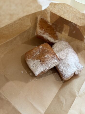 初めましてのベニエさん、揚げパンのようお味で粉砂糖の優しい甘さとモチモチ食感が美味しかったです🤤