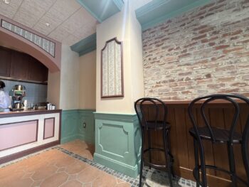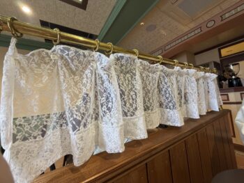 イートインスペースもしっかりあり、カフェカーテンの仕切りもかわいいです♥